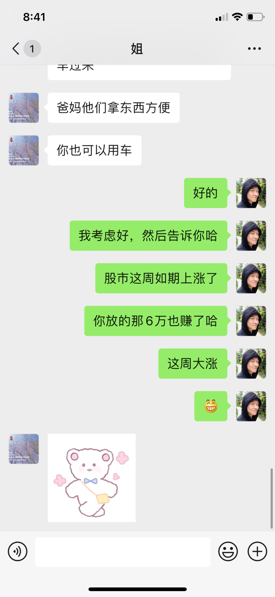 自从2014年到2016年,我怂恿她卖房把钱给我抄底股市,她大赚了一笔后,她的资金就一直放在我这里,然后,每次有点小钱,都会问我什么时候给我,可以追加点资金。